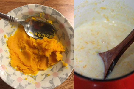 step2:对南瓜进行处理。将其切成片状后,放入锅中直至蒸熟。然后借助勺子等工具,将其压成泥状。