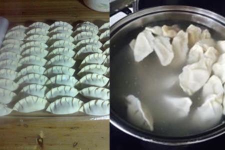 6、在煮锅中倒入足够量的水,水煮开后把饺子全部下入,待饺子浮上水面就可以用漏勺捞出,按照个人的口味喜好,蘸酱食用。