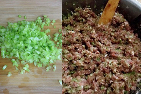 4、将西芹择去旧叶,洗净上面的杂质和泥沙。把处理干净的芹菜用刀剁成碎末状,也可以往里加些盐来挤出芹菜中的水分。把沥干水的芹菜加入腌制的驴肉馅中,进行充分地混合搅拌。再逐一往里加入些许的盐、油、五香粉进行搅拌,这样馅料就算是制作好了。