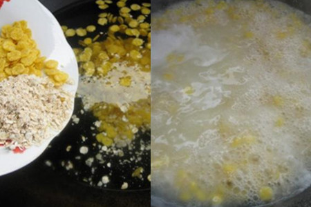 将锅清洗干净,倒入适量的清水,再将清洗好的燕麦片和玉米片倒入清水中,大火将锅中的水烧开,让锅中的食材沸腾5分钟,然后转小火慢慢熬煮15分钟左右。这里需要注意,燕麦是基本不会发胀的食材,所以往锅中倒水的时候尽量不要倒太多,燕麦粥太稀了就不好喝了。