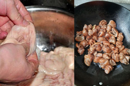 1、先将买回来的大肠,从粗的一端开始翻面。翻到十多厘米后,便可往里开始灌水。这样利用水的重力便可以轻松将整个大肠翻面,不仅省事还省时间。翻面后将大肠壁上的油脂去除,如果喜欢吃比较肥的大肠,也可以适当地保留一些。