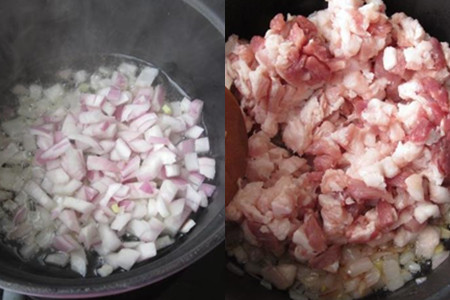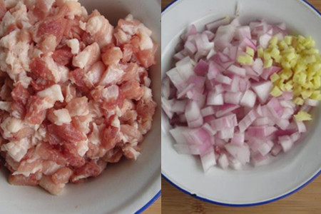 五花肉洗干净切成小丁。洋葱洗干净切成和肉丁一样大小的丁状,生姜洗净剁成末。