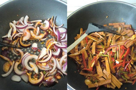 炒出香味之后,下适量辣椒酱一起煸炒。炒出辣味之后,加入切好的洋葱条,用铲子炒匀。烹入适量生抽,调入少量白砂糖,炒匀。然后倒入香干条和青红椒条,调至大火翻炒。翻炒数分钟之后,淋入适量香油,加入少许鸡精,翻炒均匀就可以熄火装盘了。