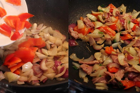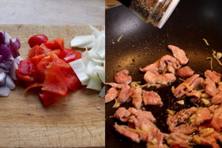 咸肉切成片状,洋葱和红椒洗净切成小片,生姜洗净切成丝,大蒜去皮拍碎。炒锅上灶,加入适量油,油热之后,下咸肉片、姜丝和蒜末煸炒片刻,撒些白糖和胡椒粉炒匀盛出锅备用。