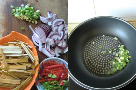 香干切成细条,青红椒洗净切成细条,洋葱洗净切成长条,香葱洗净切成小段。炒锅上灶,往锅里加适量油,开火加热,下葱段煸炒。