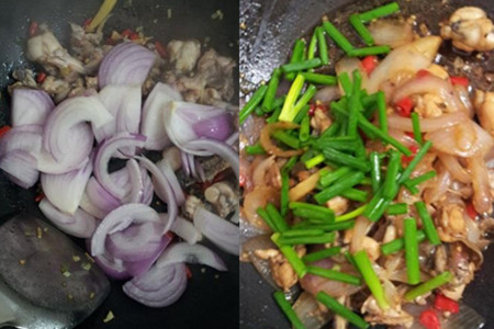 炒出香味之后,将腌好的田鸡沥干水分下锅,炒干水分。接着加入洋葱块一起翻炒,烹入适量料酒和少许清水,加盖,调至大火焖两分钟。两分钟后,开盖,调入适量食盐、生抽、鸡精和胡椒粉,炒匀,下葱叶段收汁即可熄火。