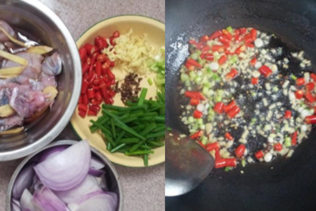 食材:咸肉120克、洋葱200克、红椒60克、大蒜、姜、盐、油。