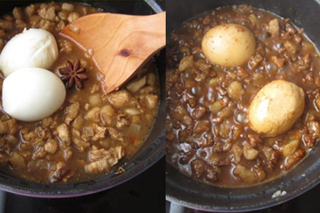 接着烹入适量料酒、老抽、蚝油和生抽,加入一大碗开水,放入几粒八角、冰糖和两个剥壳的鸡蛋,加盖,调至中火慢炖,直至肉丁酥烂。
