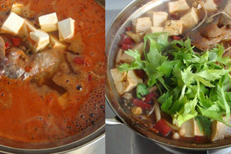 食材:石斑鱼1条、豆腐400克、绿豆芽、菌菇、麻辣汤料、芹菜叶。