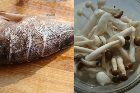 石斑鱼去掉鱼鳞和内脏,清洗干净,用刀在鱼背上每隔三厘米划上一刀,但是不要划断。菌菇去掉根部,清洗干净待用。