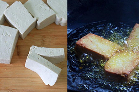 豆腐切成大块,再将每一块从中间切一个口子,不切断。炒锅上灶,注入小半锅食用油,开中小火烧热,油热至七成,放入豆腐块炸制,炸成金黄色后捞出控油晾凉。