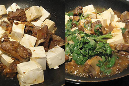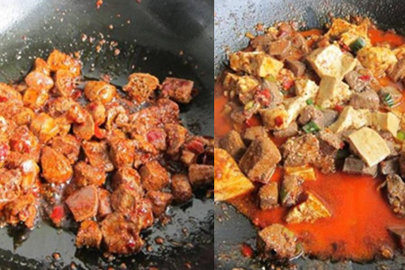 往锅里加适量食用油,油热至八成,下适量豆瓣酱煸炒。豆瓣酱炒出红油之后,下猪肝翻炒。猪肝炒变硬之后,调入适量料酒、葱姜末,翻炒均匀。接着调撒入适量的花椒粉,烹入适量生抽,放入豆腐块,用铲子慢慢炒匀,再注入适量清水,调至中火烧十分钟。十分钟后,加适量鸡精和水淀粉,炒匀,调至大火收汁,出锅前撒入适量胡椒粉,炒匀即可熄火。