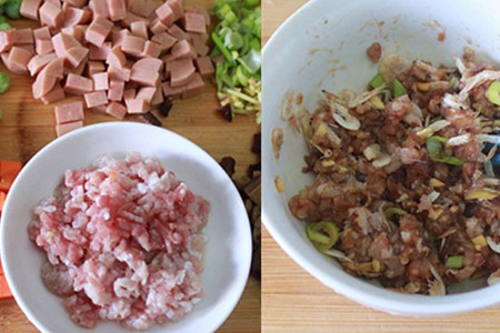 火腿切成丁状,胡萝卜去皮切成丁状,干香菇泡软也切成丁状,葱姜蒜洗净切成末。猪肉馅装入碗里,加适量五香粉、虾皮、葱末、姜末、香油和酱油,搅拌均匀备用。