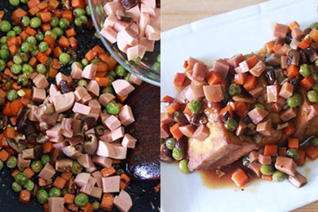 蒸豆腐的同时,炒锅上灶,倒入适量油,油热之后,下葱末、姜末和蒜末煸炒。炒出香味之后,加入青豆和胡萝卜丁,调入适量酱油,翻炒均匀。接着将火腿丁和香菇丁下锅,炒匀。然后倒入两勺鲜汤,调入少许食盐和鸡精,加入水淀粉,翻炒片刻即可熄火。取出蒸熟的豆腐,将炒锅里的汤汁和食材浇在豆腐上即可。