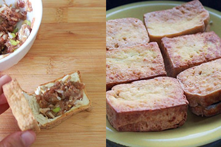 豆腐块晾凉之后,用刀在之前的切口处划一下,打开豆腐,将里面的豆腐挖出来,取适量猪肉馅放入豆腐里,再合并起来,依次将所有豆腐块装好肉馅。蒸锅上灶,注入适量清水,开大火烧开,蒸锅上汽之后,放入所有豆腐块,加盖,蒸十分钟。