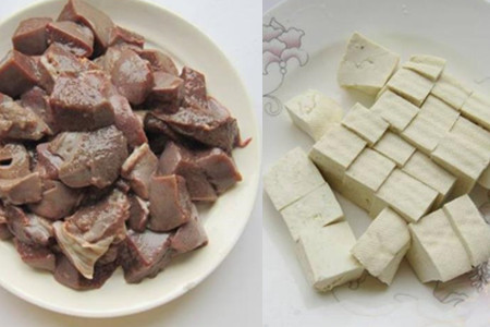 猪肝用清水漂洗掉血水,清洗干净,斩成小块。豆腐切成小块,葱姜洗净切成末。