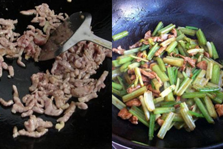 继续往锅中倒油,将芹菜倒入锅中翻炒,炒至芹菜绵软熟透后倒入香干,加入食盐翻炒,大概2分钟后倒入炒好的肉丝,翻炒均匀试一下味道,加入适量的鸡精,倒一点清水到锅中,焖制半分钟就可以起锅了。