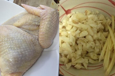 2、将生姜用刀切成细丝,蒜切成碎粒状,置于一边待用。
