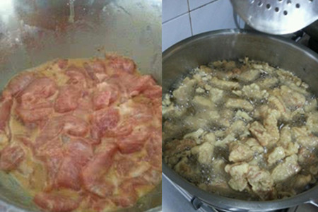 4、在炒锅之中下入些许的食用油,油温加热至七八成时。用筷子将肉片逐一下入油锅之中,炸至其表面金黄,即可用漏勺捞出沥干上面多余的油。