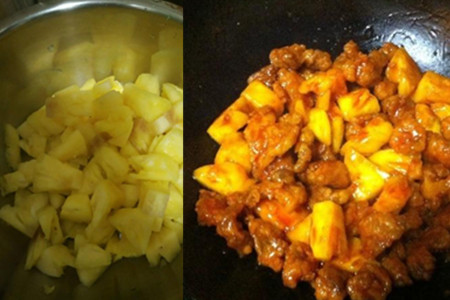 7、将酱汁一齐倒入锅中,熬煮至其浓稠后,便可以把之前备好的青红椒、菠萝肉、肉块一齐倒入锅中,翻炒至其充分地裹上酱汁便可装盘食用。