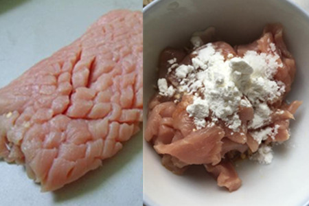 1、先将买回来的新鲜的里脊肉洗净表面的血水,用刀将里脊肉从中间切开。将里脊肉平铺在砧板上,用刀斜切肉片,再反方向垂直切肉片。但是不用切断,只要使里脊肉上呈现网格状即可。这样会使肉更加容易入味,口感更佳。