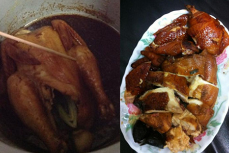 3、在煮锅之中逐一加入食用油、与油等量的酱油、盐、香油,用勺子进行均匀地搅拌。将鸡肉块一齐下入煮锅之中,用勺子搅拌,使汤汁没过鸡肉,让每一部位的鸡肉都可以充分地吸收汤汁。