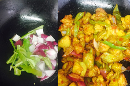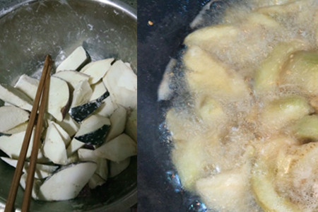 切好的茄子外面裹一层干淀粉,红辣椒切丝备用。铁锅加入食用油,准备好适量的蒜末,待油温升高后,把香葱段和蒜末放入锅内爆香。然后把茄子块放入油锅里,大火翻炒。做烧茄子时,食用油要多放一些,这样做出来的茄子味道比较好。外层淀粉变黄后就可以把茄子先拿出来了,然后重新放油,加入干辣椒后文火翻炒。如果有黄豆酱,可以适当的倒入一些。