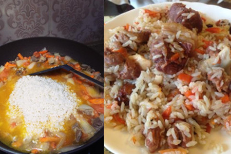 4、炒至羊排两面皆呈现金黄的色泽,便可往锅中加入红萝卜。翻炒片刻后,往里头倒入适量的清水。如果家里有高汤,也可以往里加入高汤,这样做出来的手抓饭会更加香甜可口。
