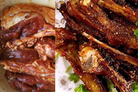 4、在羊排上倒入适量的烤肉酱,撒上些许的孜然粉和辣椒粉,加入事先准备好的葱段和生姜片,淋上些许的白酒。如果家里没有白酒,也可以使用料酒来替代。用筷子搅拌均匀,腌制一个晚上。羊排一定要腌制久些,这样羊排的味道会更入味、口感更佳。