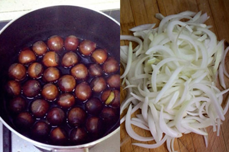 2、先将栗子用剪刀在头部剪一道口子,将其投入煮锅之中,煮上十分钟。趁热将栗子取出,剥除外壳和薄皮,放在一旁备用。