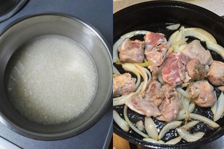 2、将大米用清水淘洗三遍,洗净后浸泡在清水中,浸泡大概二十分钟上下。把胡萝卜削去外皮,洗净后用刀切成小段。洋葱削皮,洗净切成丝状。将羊排洗净表面的血水,剁成长短适当的段状,放在一旁备用。