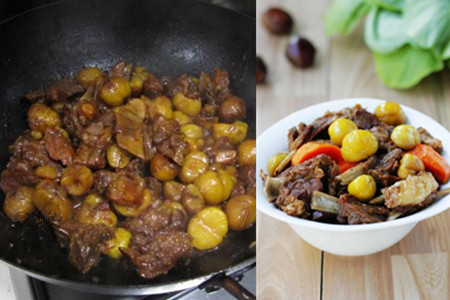 6、待羊排充分吸味后,倒入适量的清水。大火煮开后,改为小火再炖煮一个钟头。羊排炖烂后,往锅中加入栗子,炖煮十五分钟。临出锅前,撒上些香菜或者葱花便可上桌食用。