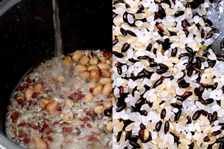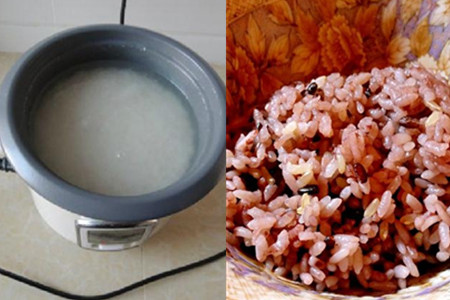 清洗杂粮。将三种米按照1:1:1的比例取适量放入盆中,加入适量的清水,将米仔细的搓洗一下。黑米的淘米水是黑红色的,洗很多次还是这个颜色,这个色素是天然的,可以食用,洗的时候不要纠结以为没洗干净。