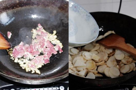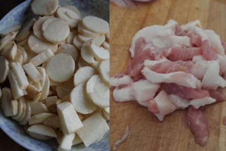 将清洗干净的山药切成薄一点的片状。猪肉清洗一下后切成大小适宜的肉片。猪肉稍微切薄一点,这样不仅炒制的时间短,也容易炒出香味来,薄薄脆脆的更香更好吃。