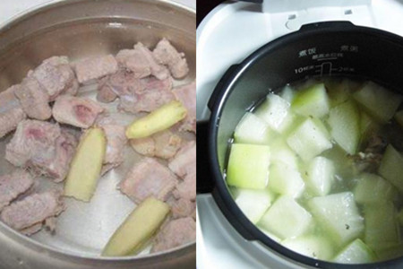 炖煮冬瓜汤。将剁成块的骨头放入锅中加水煮一下,煮开以后去掉血沫,将骨肉放入炖锅内胆中,加入几片切好的生姜,再将切好的冬瓜铺在骨头上,撒上少许食盐,加入适量的清水。将锅盖盖上,通电,开始炖冬瓜汤。