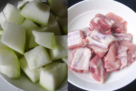 处理食材。将冬瓜去掉外皮后放在水龙头下用流动的清水冲洗干净。将冲洗干净的冬瓜切成大小合适的块状放入碗中备用。切冬瓜的时候要注意,不要切得太小,不然炖的时候容易钝化了,想吃绵软一点的可以切稍微小一点,想吃硬一点的冬瓜块可以切稍微大一点。骨肉清洗干净后剁成块备用。