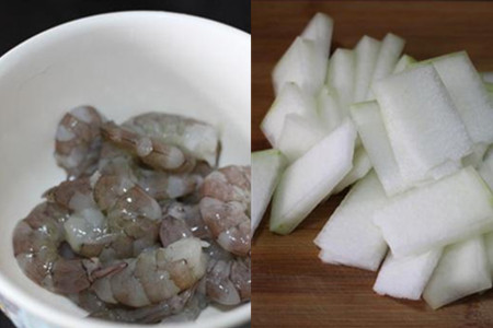接下来要处理好食材。将冬瓜去皮后放在流动的水下面冲洗干净,切成厚度均匀的薄片放在一旁待用。将基围虾去掉头和尾部的外皮,并用牙签将虾线挑干净。基围虾尾部的肉剥出来就是虾仁了,虾仁剥好以后要用清水清洗两遍,彻底清洗干净。清洗干净以后放入碗中加入一点食盐搅拌均匀并腌制一会儿。食材处理好以后就是准备制作菜肴了。