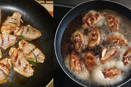 然后把沥干水分的鸡翅放进去,注意不要迸溅热油。中火煎鸡翅就可以,等待鸡翅两面都煎成金黄色就可以放入调味料了。加适量的精盐和生抽,慢慢翻炒几次后,把可乐倒入锅内,加一些蚝油。可乐里面含有大量糖分,所以不要盖上锅盖,否则汤汁很快就会溢出来。