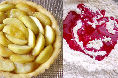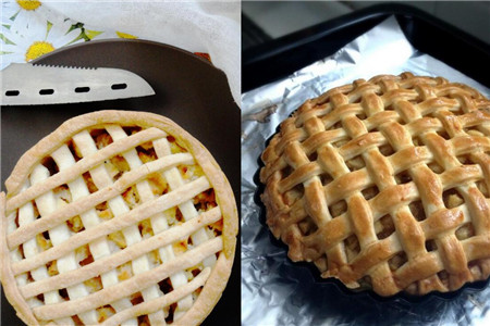 苹果的多少取决于个人的喜好,之后再将另外一部分的面团切成整齐的条状。按照一种交叉的方式整齐排列在苹果上,尽可能的将苹果完全覆盖,放入烤箱内烘焙半小时左右即可食用。
