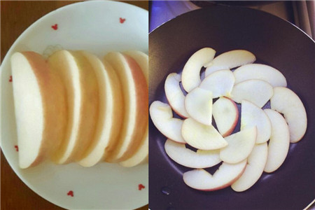 切好的苹果装在盘里待用,这个时候要及时的热锅,因为苹果暴露在空气当中很容易被氧化,苹果的色泽会发生比较明显的变化,所以我们需要把握住时间,尽可能的减少苹果氧化的时间。开大火将锅烧热之后,就可以将苹果倒入其中,需要注意的是,炒苹果的时候无须放油,只需要我们加入适当的糖,糖的分量也可以根据个人的口感来决定。