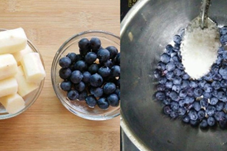 步骤3、在蒸的时间段也不要浪费了,可以先做蓝莓酱。把蓝莓洗净,然后倒入锅里面,加入一些白糖,煮熟。