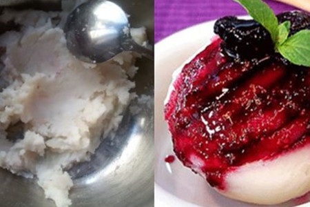 步骤6、将做好的山药泥,用手或者大勺子,把它定成一个雪球状,之后再淋上煮好的蓝莓酱,一道精致又健康的点心就出来啦!建议造型上可以根据自己的想法创作,用饼干的模具也可以,这样小孩子看了也喜欢吃。