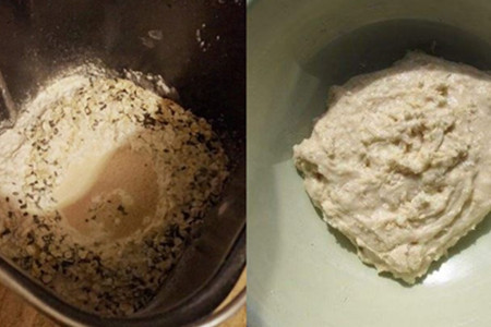 步骤1、首先,把面粉和杂粮一起混合在一起,比例为2:1,随后依次加入鸡蛋、盐、水和酵母,搅成面团。(注意在加水的时候不要加得太多,可以一边搅一边加,这样面团才不会太稀。)