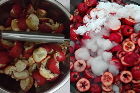 首先,将新鲜的山楂清洗干净,清除山楂核之后,将山楂切成小块放入榨汁机里面加入适量的清水开始榨汁。接着,将打好的山楂汁过滤之后倒入锅中开始煮,并加入适量的白糖和柠檬汁。等山楂汁熬到变得十分粘稠的时候就可以关火了。之后,再倒入保鲜碗里面放凉就可以了。