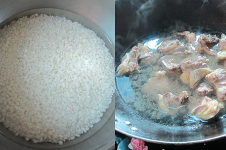 糯米提前用清水泡两个小时左右。鸭肉洗干净斩成大块,冷水下锅,开火烧开,捞出锅冲洗干净,滤干待用。