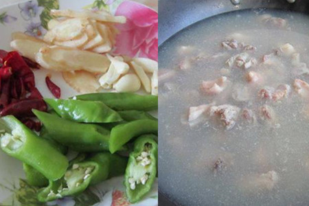 仔姜洗净切成薄片,大蒜去皮切片,干辣椒泡软切小段,青辣椒洗净切成小段。烧一锅开水,将鸭子洗净剁成小块下锅烫一下,捞出锅,冲洗干净,沥干水分待用。