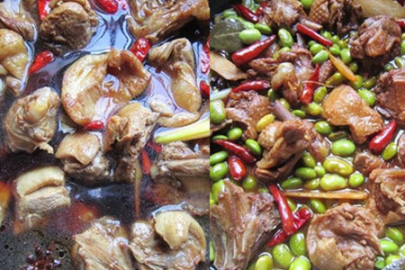鸭块炒至表皮微黄时,盛出锅里多余的油脂,下姜蒜片煸炒出香味,再下干辣椒和八角煸炒。干辣椒炒出香味之后,沿着锅边烹入适量老抽、料酒,注入适量开水,调至大火煮开,再调至小火,加盖焖煮。焖煮一个小时后,开盖,放入已经去壳的毛豆,再加盖焖煮至鸭块和毛豆都完全软烂,出锅前调入适量食盐即可。