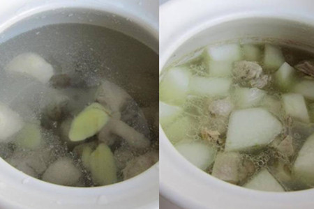 准备一个干净的砂锅,往锅里加入烫过的鸭块,注入适量清水,加入姜片和料酒,开大火煮沸。煮沸之后,将墨鱼干片下锅,调至中小火煲四十分钟。四十分钟后,将冬瓜去皮切大块下锅,再煲十五分钟。十五分钟之后,调入适量食盐、胡椒粉,撒上些葱末即可。