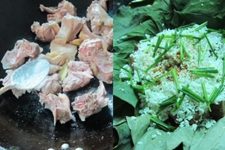 取一个油锅,油热之后,下生姜片煸炒,炒出香味之后,倒入滤干的鸭块,调入少许食盐翻炒。鸭块炒变色之后,调入适量辣椒粉、十三香、咖喱粉、生抽,翻炒匀。荷叶清洗干净,将泡好的糯米铺在荷叶上,把炒好的鸭块码在糯米上,再盖上一层糯米,撒上些葱段,将荷叶包起来放入电压力锅里蒸半小时即可。