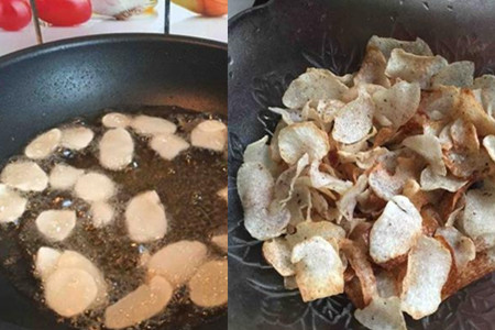 将锅洗干净,倒入适量的油,大火将油烧至6分热,将吸干水分的山药片倒入锅中炸熟。这里需要注意,为了让山药片炸得更脆更好,炸的时候一次不要往锅中放入太多,避免搅拌的时候搅碎。炸好的山药会翻小卷,这个时候就可以将山药捞起来了。将锅中的油烧至8分热的时候再将山药倒进去炸一下。
